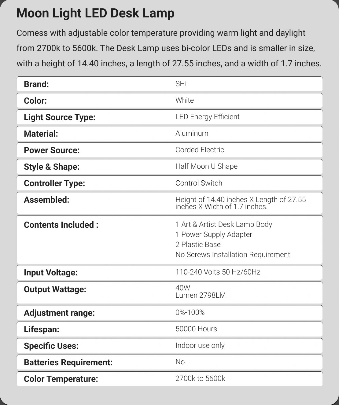 Half moon U shape light system, Moon Light LED Desk Lamp features adjustable height and brightness settings, as well as a flat, stable base.